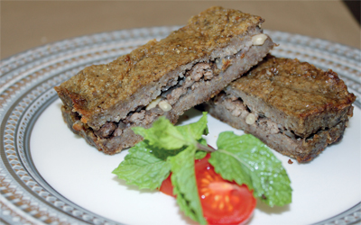 توزع الحشوة على طبقة الكبة، ثم توضع طبقة أخرى من الكبة فوق الحشوة.