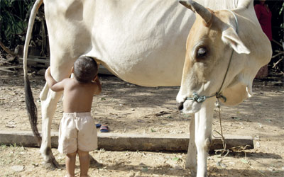 طفل كمبودي يرضع الحليب من البقرة مباشرة