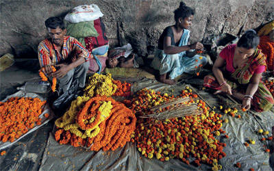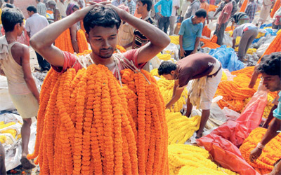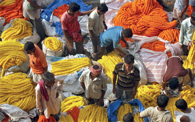 باعة يجهزون الزهور لعرضها خلال مهرجان تقليدي في مدينة كلكتا الهندية، إذ يحرص كثيرون على تزيين منازلهم بالزهور خلال ذلك المهرجان.