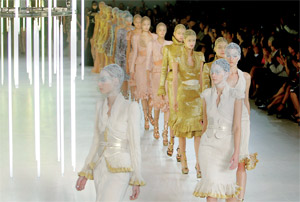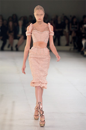 مجموعة من العارضات يقدمن عدداً من ابتكارات مصممة الأزياء البريطانية سارة بيرتون، خلال عرض أزياء دار الأزياء البريطانية الشهيرة أليكساندر ماكوين، خلال أسبوع باريس للموضة للملابس الجاهزة، لربيع وصيف 2012 الثلاثاء الماضي.
