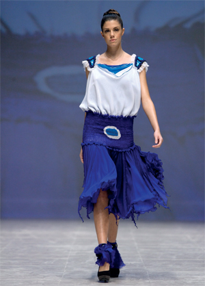 تفاوتت القصات بين المتموجة المتفاوتة الأطوال الجامعة لدرجات الأزرق، أو القصيرة الواسعة المزينة بياقة من الخيوط البارزة، أو الطويلة المطرزة بالكامل بالمربعات الزرقاء التي تزينت كل منها بحبة متدلية من «حجر العين»، بينما زين مركز الصدر في مجموعة أخرى بأحجار وتطريزات لهذا الحجر، بينما فاجأ الحضور بفستان تكون بالكامل من دائرة «حجر العين» بأطراف مكشكشة.