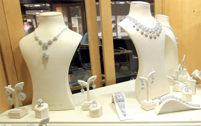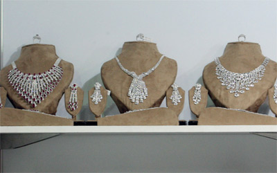 لم تقتصر معروضات أسبوع دبي الدولي للمجوهرات كعادتها، في دورته السادسة عشرة، على المجوهرات بمفهومها العام كشكل من أشكال الزينة الشخصية مثل القلادة، الخاتم، الدبوس، الأقراط والسوار، بل تعدتها لتشمل أشكالاً أخرى من الزينة، كالتحف الفنية المصممة من الذهب والمرصعة بباقة منوعة من الألماس، أبرزها تحفة على شكل مسدس من الذهب الروز عيار 18 قيراطاً، يزن 255 غراما، ومرصع بـ115 قيراطا من الألماس، تبلغ قيمته نحو 459 الف درهم ومرفق معه طلقات ذهبية، غير حقيقية، صنعت كالمسدس من الذهب الوردي، وزين رأسها بالألماس، ومن المجموعة نفسها عرضت ميدالية كبيرة أخذت شكل الميكروفون الذي رصع بثلاثة أنواع من الألماس، الأبيض والأسود والذهبي، بلغت قيمته 183.5 ألف درهم.