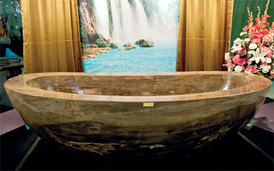 ظل حوض الاستحمام المنحوت في صخرة من حجر «كايجو» الكريم، الذي يبلغ سعر الحوض الصغير منه ستة ملايين و400 ألف درهم، «نجم» أسبوع دبي الدولي للمجوهرات، حتى قبيل ساعات قليلة من إسدال الستار عليه، مساء أول من أمس، في مركز دبي الدولي للمؤتمرات والمعارض، فقد قام مشتري الحوض، الذي طلب عدم الكشف عن هويته، بحجز حوضين آخرين بالقيمة ذاتها، واشترى أحد كبار الشخصيات الحجم الأكبر من الحوض البالغ سعره 5.98 ملايين درهم، ليصبح بذلك حوض استحمام «كايجو»، أشهر مبيعات دبي للمجوهرات .2011