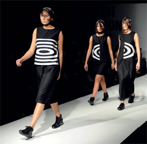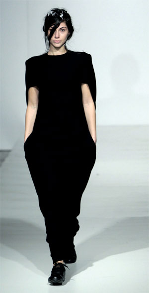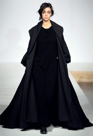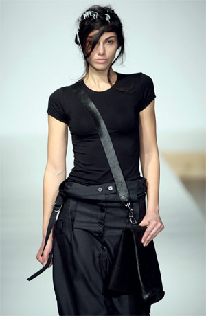 عارضات يقدمن مجموعة من ابتكارات المصمم الجورجي جورج شاغاشفيلي، والتي فضل أن يقدمها بالأسود كلون سائد على معظم المجموعة ما عدا بعض القطع البسيطة التي قدمها باللون الرمادي الداكن، أو تلك التي تزينت بلمسات بسيطة الحلقات البيضاء فوق الخلفية السوداء، وذلك خلال أسبوع الموضة في العاصمة الجورجية تبليسي، أول من أمس.