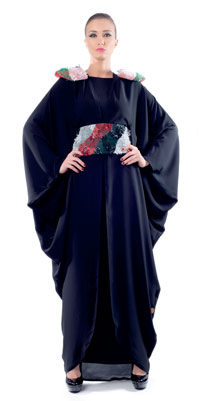 ركزت المصممة أيضاً على فكرة تجميع القماش بكثافة «الدرابيه» في عباءة أخرى بدت أقرب إلى الفستان الضيق عند الجذع من الحرير مزينة إياه بألوان العلم، والتي بدت أقرب إلى فكرة العلمين المتعاكسين على شكل الفستان اللف، بينما تنسدل عباءة أخرى واسعة مفتوحة عليها، إضافة إلى أخرى كانت الأكثر تميزاً، والتي تمثلت بعباءة واسعة حريرية تتجمع بكثافة من الأمام ويمكن تثبيتها بحبل من الحرير المظفر بينما تتكون التجمعات الحريرية من ألوان علم الدولة، ويرتبط بطرف العباءة وشاح حريري شيفوني كبير يوضع على الرأس لتغطية الشعر، كما يمكن ارتداء الحجاب لتغطية الشعر بالكامل أسفل الوشاح.