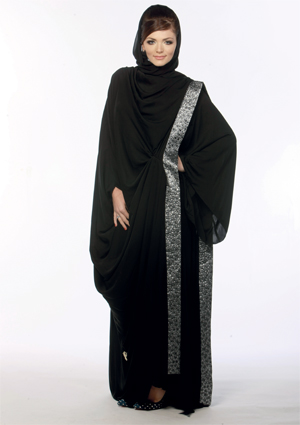 عباءة ذات قصة مميزة يزيّنها شريط من البروكار الفضي على طول الجانب الأيسر، مناسب للعشاء والسهرة . من تصميم هوما قمر، وتبدأ الأسعار من 2300 درهم. تتوافر في كل من «يونايتد ديزاينرز» في «مردف سيتي سنتر» بدبي.
