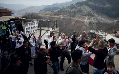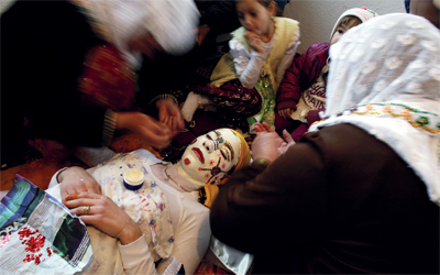 عروس بلغارية مسلمة تستسلم لزينة وجهها التقليدية، التي تقوم بها عائلة العريس، والتي تتكون من طبقة سميكة من الصبغ الأبيض المزيّن بحبات الترتر الملوّنة اللمّاعة، بينما يتخذ العريس رحلته الراقصة في قرية ريبنوفو إلى منزل الزوجية المصاحبة للموسيقى والرقص و«التنقيط»، أي إهداء العريس المال هدية للزفاف، وتعد قرية ريبنوفو، التي تبعد 130 ميلاً عن جنوب العاصمة البلغارية صوفيا، إحدى القرى المسلمة التي حافظت على مدى مئات السنوات على التقاليد الخاصة باحتفالات الزفاف الشتوي. نسبة المسلمين 10٪ من تعداد بلغاريا المكوّن من 7.4 ملايين نسمة.