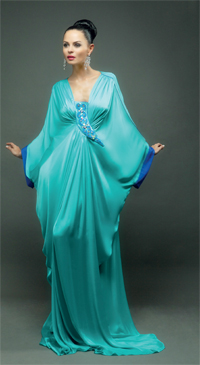 جلابية ذات قصة مميّزة من الحرير الأزرق الفاتح، تتميز بتصميم مبتكر عند منطقة الصدر يميل إلى الجذع، مناسب للأمسيات والمناسبات الخاصة.