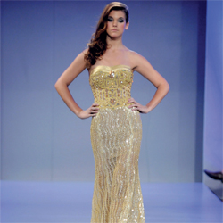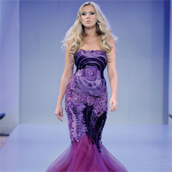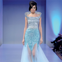 قدم المصمم أيضاً قصة كتف عارية، ومرتفعة نافرة إلى الأعلى، فوق قصة حورية لقماش من الترتر الأزرق الفاتح المتدرج، وتنورة شفافة من التول السماوي الفاتح، وهي خامة الترتر التي اعتمدها المصمم أيضاً في مجموعة متعددة من الفساتين، في محاولة للمزاوجة بين خامات الترتر والخامات المزينة بالكريستال، إذ قدم المصمم من قماش الترتر الأزرق الفاتح المتدرج فستان آخر تداخلت فيه درجات الترتر الفضي، والمكوّنة من فستان ضيق من الترتر الكامل، تحت طبقة متسعة وكثيفة من التول الأزرق السماوي البادئ من تحت الصدر والمزين بشريط حريري سميك و«فيونكة» كبيرة.