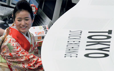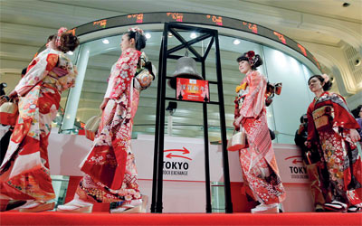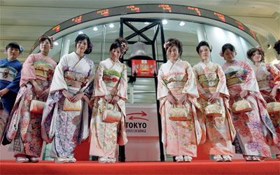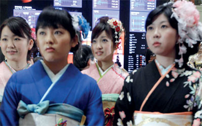 فتيات يابانيات يرتدين الزي التقليدي الـ(كيمونو)، بالقرب من شاشات العرض للبورصة في العاصمة طوكيو، خلال حفل الافتتاح للسنة الجديدة.