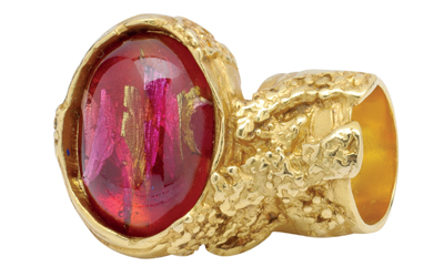خاتم ذهبي بتصميم مبتكر وحجر أحمر كبير يزين مركزه، مناسب للكوكتيل والسهرة بـ 579 درهماً، وسوار مكون من سلاسل ذهبية في نصفه، وقفل جلدي في نصفه الآخرأ مزين بمجموعة من الميداليات التي تحمل العلامة التجارية (لوغو)، مناسب للخروج اليومي والعشاء بالسعرأ نفسه،أ تتوافر في كل من «دبي مول»، و«مول الإمارات» في دبي.
