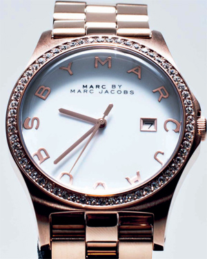 ساعة يد نسائية باللون الذهبي الوردي، مزينة بخط ناعم من الكريستال، من مجموعة اكسسوارات «مارك باي مارك جيكوبس» بـ1070 درهماً، وتتوافر في كل من «دبي مول»، و«مول الإمارات» في دبي.
