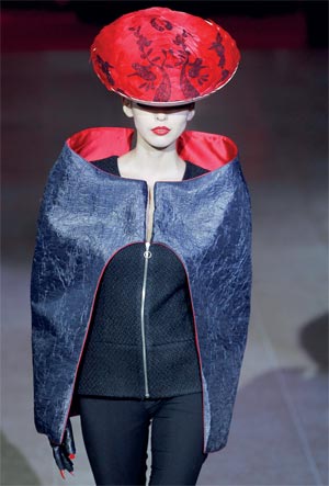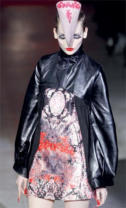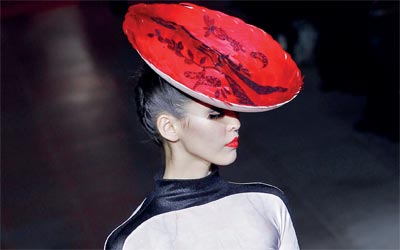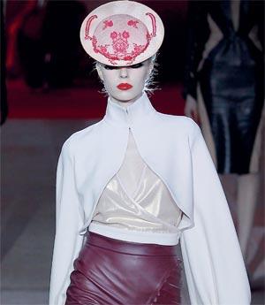 عارضات يقدمن مجموعة من التصاميم، للمصممة فاطمة لوبيز، خلال أسبوع باريس للموضة لخريف وشتاء 2012 للملابس الجاهزة، أول من أمس، وركزت التصاميم على استخدام الجلد والفرو والخامات المطبعة والكثير من القبعات المستديرة الحمراء.