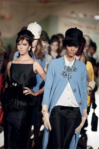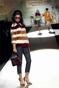 عارضات يقدمن أحدث مجموعات العلامة التجارية «دسكواريد 2»، خلال «أسبوع ميلان للموضة» لخريف وشتاء 2012 للملابس الجاهزة، الذي اختتم أول من أمس، مقدماً مجموعة مستوحاة من خمسينات القرن الماضي.