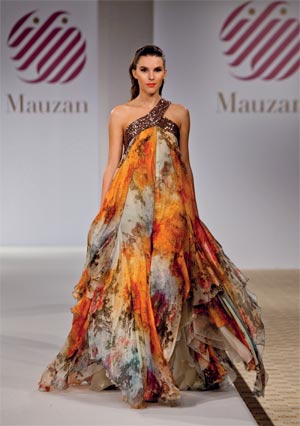 أكثر ما ميز فساتين السهرة هي تلك المحاولات لكسر بريق الترتر بالشيفونات المغطية له، سواء تلك التي ثبتت عند الصدر لتنسدل مفتوحة وواسعة تكشف عما تحتها من فساتين ترتر ضيقة، أو تلك التي تعلقت بكتف واحد وتجمعت على الخصر بحزام ثبتها في جهة واحدة فقط لتنكشف الجهة الأخرى من الخصر وما يظهر منها من ترتر بني محروق أقرب إلى لون الصدأ، في اختيار ذكي لألوان الدرجات المعتمدة، لتنسدل الشيفونات المطبعة متموجة وواسعة فوق الفساتين الضيقة، أو تلك المزينة بحمالات عريضة وإطار للصدر معلقة على جهة من الرقبة لتنسدل تموجات متفاوتة الأطوال وواسعة لكامل الشيفون المطبع المكون للفستان.