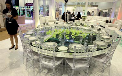 بتنظيم مميز وبفخامة واضحة توزعت منصات عرض آخر صيحات المنتجات التي تستحقها عروس ،2012 من أغطية أسرت الزفاف المشغولة بالكريستال والمنسوجة من الحرائر الطبيعية والشيفونات التي كانت حكراً على خياطة الملابس، إضافة إلى أطقم الفوط والمناشف وقمصان الحمام ملوكية المصنوعة من أجود أنواع القماش وأكثرها جودة، والتي زينت بالشرائط والخيوط المذهبة والفضية والنقوش والخطوط العربية التي نقشت اسمي زوجي المستقبل.