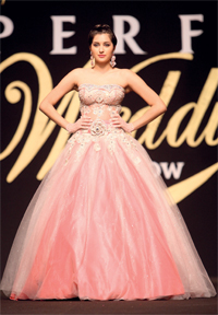 كما قدمت فستانا من التول المنفوش من الأسفل بلون البيج وصدرية مشغولة بكريستال كثيف على شكل نجوم باللونين الفضي والبيج، كما نثرت نجوم صغيرة على الفستان، فيما عرض فستان رقيق باللون الوردي الفاتح والمصمم من قماش الشيفون الطبيعي الذي غطى جسد العارضة مع بطانة من قماش التول، مع سوار على خصر العارضة من الكريستال والفصوص اللامعة من لوني الفضة والزهر، فيما طرز الصدر بزهور صغيرة تغطي المكشوف منه.