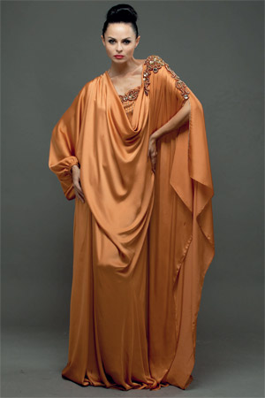 عباءة ذات قصة مميزة من الحرير البرتقالي العسلي مزيّنة على الكتف والصدر بمشغولات ذهبية وعسلية، من تصميم الإماراتية مريم الشيباني. تبدأ الأسعار من 1300 درهم. تتوافر في «مردف سيتي سنتر» بدبي.