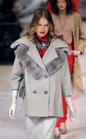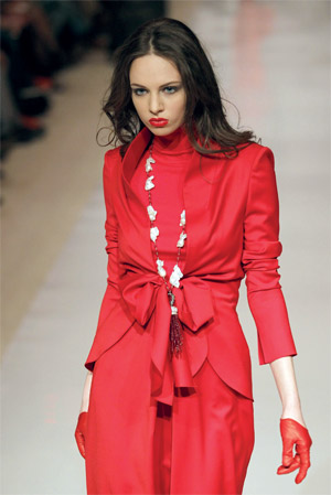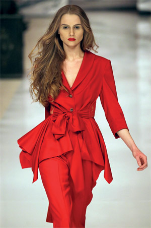 عارضات يقدمن آخر مجموعات مصممة الأزياء الأوكرانية جوليا آيسينا، خلال «أسبوع أوكرانيا للموضة» في العاصمة كييف، أول من أمس، وهي المجموعة التي جعلت من اللون الأحمر لوناً رئيساً لها، إلى جانب الرمادي الفاتح.