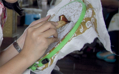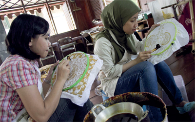 نساء يزين خامات قطنية بنقوش من الشمع الذائب، خلال دورة تدريبية على تزيين خامات «الباتيك»، ضمن برنامج يقام في متحف الأقمشة بالعاصمة الإندونيسية جاكارتا، ويعتبر قماش الباتيك الإندونيسي التقليدي إحدى الخامات التي تتم صناعتها عبر مراحل صبغ متعددة لتكوين الطبعات المميزة التي تزينه، ويعد الـ«باتيك» أيضا نوعا من الفنون المعروفة في تلك المنطقة على مدى قرون، بينما كان يتم الاحتفاظ ببعض النقوش والطبعات لطبقة النبلاء فقط.