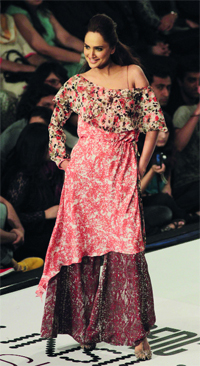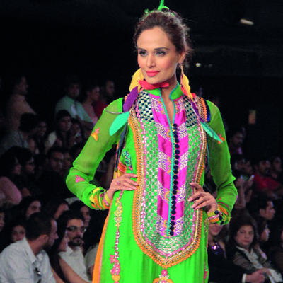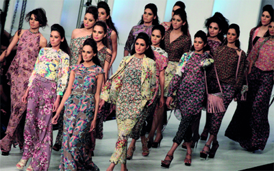 عارضات يقدمن أزياء لمصممين مشاركين في أسبوع أزياء الحرير في لاهور.