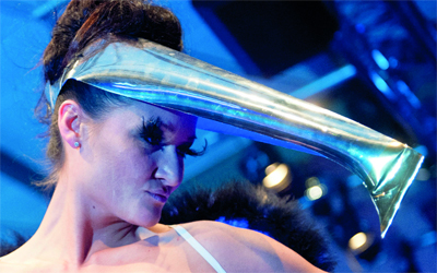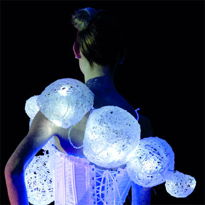 طالبات في كلية تصميم الأزياء في مدينة أوفنباخ الألمانية يعرضن نماذج من تصاميمهن المضيئة في فرانكفورت.