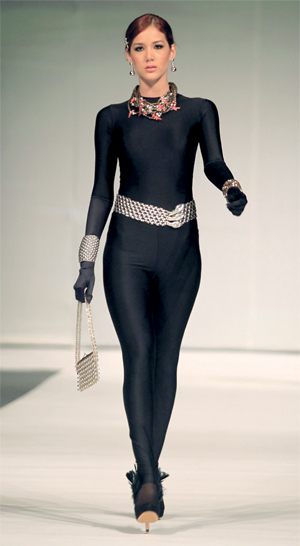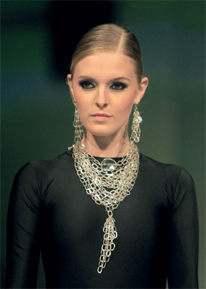 عارضات يقدمن مجموعة من المجوهرات التي ابتكرتها المصممة البيروفية إيلاريا، خلال اليوم الثاني من أسبوع بيرو للموضة في العاصمة بيرو، ليما، الثلاثاء الماضي.