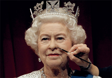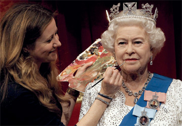 موظفة من متحف مدام توسو تضع اللمسات الأخيرة على مجسم جديد للملكة إليزابيث ملكة بريطانيا، وتم إعداد هذا المجسم بمناسبة اليوبيل الماسي للملكة. وتحظى إليزابيث بشعبية كبيرة بين أوساط البريطانيين، ويعتبرونها رمزاً محبباً، على الرغم من إنقاد الكثير من الشعب البريطاني لمبدأ الحكم الملكي.