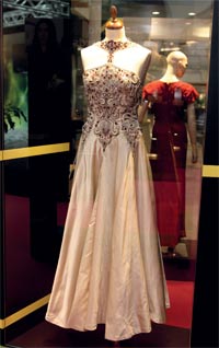 تحتل الفساتين مساحة مهمة من المعرض، اذ عرض أكثر من 11 فستاناً الى جانب القطع المكملة لها، مثل الفرو والقبعات والأحذية والإكسسوارات، وكذلك قفازاتها السوداء الموقعة، ليكون العدد الإجمالي للقطع، التي سبق أن ارتدتها ملكة البوب، 18 قطعة.