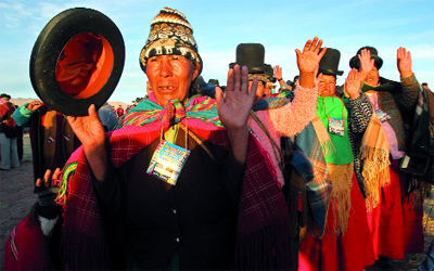 احتفلت قبائل الأيماراس، السكان الأصليون في بوليفيا، اول من أمس، بحلول عام ،5520 بحسب تقويمهم الخاص. وأقيمت مراسم الاحتفال بقلعة تياواناكو، في حضور نائب رئيس البلاد ألبارو جارسيا لينيرا، بصحبة رفيقته الصحافية كلاوديا فرنانديز.