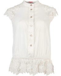 قميص أبيض قطني مناسب للصيف بأكتاف مزينة بقطع من الدانتيل القطني، وحاشية متعرجة مزينة بالدانتيل ذاته بـ 550 درهماً، إضافة إلى قلادة ناعمة بطبقتين من الكريستال البيج الشفاف بـ 255 درهماً، يتوافران في «دبي مول» بدبي.