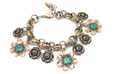 سوار معدني ذو تأثير معتق مزين بمجموعة من ميداليات الورود المزينة بأحجار الكريستال الفيروزي، بـ25 درهماً، ويتوافر في فروع «سنتر بوينت».