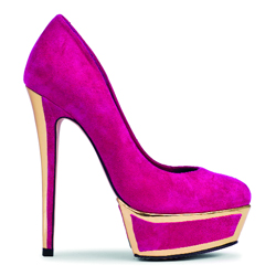 حذاء سهر أنيق مزيّن بكعب وقاعدة ذهبية من جلد الشمواه الفوشي بـ859 درهماً. يتوافر في كل من «دبي مول»، و«مول الإمارات». و«فيستفال سنتر» في دبي.