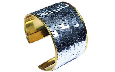 سوار عريض من المعدن الذهبي المزيّن بالترتر الفضي بـ25 درهماً. يتوافر في فروع «سنتر بوينت».