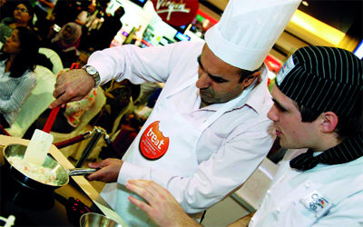 كان زوار «أطايب» مهرجان برجمان للمأكولات العالمية، على موعد مع عروض قدمها المركز الدولي لفنون الطهي في دبي، أول من أمس، اليوم السابع على التوالي ضمن فعاليات المهرجان، حيث قدم المدربون والطلبة من المعهد عروضاً راقصةً على أنغام الموسيقى، ضمن عروض تضمنت سلسلة من ست فقرات لـ«الطهي مع الشيف».