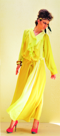 قدمت المصممة اللون الأصفر الفاقع ممتزجاً مع طبعات جلد النمر البنية الواضحة القوية، كما أدخلت مزيج الألوان الأخير مع أجزاء كبيرة من اللون الأبيض العاجي للراغبات في التقليل من قوة الألوان، مع لمسات بسيطة من اللون الفيروزي البارد. بينما اعتمد اللون الأصفر القوي في فستان واسع بكم واحد، يمكن اعتباره أفضل قطع المجموعة نظراً لقصته المميزة، والبرتقالي الناري بلونه السادة، والليموني المخضر بلونه السادة، المضاف إليها درجات أفتح وأدكن مقاربة، أعطت تأثيراً عميقاً ثلاثي الأبعاد على التصميم، إضافة إلى الأحمر الماروني الفاتح الغامق، بدرجات مقاربة ومتداخلة أعطت ذات التأثير، مع اعتماد اللون الفوشي الناعم، بتدرج بسيط وجزئي إلى البرتقالي في أجزاء من التصميم.