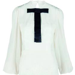 قميص بتصميم ناعم كلاسيكي مزيّن بشريط حريري أسود على الرقبة، وقطعة من «الدانتيل» الأبيض الناعم بمنطقة الصدر، مناسب للخروج اليومي والعمل والمساء مع تغيير الإكسسوارات بـ3100 درهم.