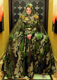 وكشفت مصممة الازياء الإماراتية منى المنصوري خلال المؤتمر الصحافي الذي عقد صباح أمس في فندق شنغريلا بأبوظبي، عن فستان غير مألوف للعروس، استخدمت في صناعته قماشاً يشبه المستخدم في البذلات العسكرية لقوات الجيش، وقالت انها استمدت تصميم الفستان من كلمة الفريق أول سمو الشيخ محمد بن زايد آل نهيان، ولي عهد أبوظبي نائب القائد الأعلى للقوات المسلحة، خلال حديثه عن الأحداث التي تشهدها المنطقة، وتأكيده ان «البيت موحد»، حيث يعبر الفستان عن استعداد المرأة الإماراتية للدفاع عن بيتها ووطنها، وان كل الإماراتيين جنود مستعدون للدفاع عن وطنهم ووحدته.