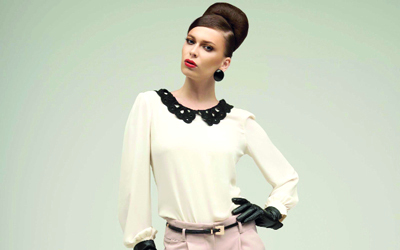 قميص بقصة أنيقة من قماش الحرير البيج المتورد مزين بياقة من الدانتيل الأسود بـ120 درهماً، بالإضافة إلى سروال بقصة رسمية وكسرات ناعمة حول الخصر بـ90 درهماً. ويتوافران في فروع «سنتر بوينت».
