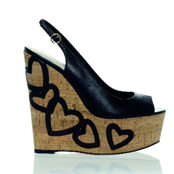 حذاء جلدي أنيق بكعب عال من الجلد البني الفاتح مزيّن بمجموعة متعددة الألوان والأشكال، مناسب للسهرة بـ1750 درهماً، وحذاء آخر من الجلد الأسود بقاعدة عريضة مزيّنة بقلوب متعددة بـ789 درهماً. يتوافران في كل من «مردف سيتي سنتر »، و«دبي مول»، و«مول الإمارات» بدبي.