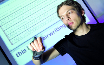أما الباحثون بمعهد كارلسروهه للتكنولوجيا (KIT) يطرحون تساؤلاً: لماذا لا يتمكن المستخدم من كتابة رسائله النصية في الهواء؟ وتحقيقاً لهذا الهدف قام العلماء الألمان بتطوير قفاز مُزود بمستشعر يقوم بتسجيل حركات الأيدي وينقلها لاسلكياً إلى برنامج التعرف إلى الحركة بالجهاز المعني، لتظهر النصوص بعد ذلك على شاشته.