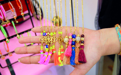وأشارت الطالبة طيف البياتي، صاحبة مشروع «ديزايني»، إلى أنها حرصت على تقديم ملابس وإكسسوارات تحمل تصميمها وذوقها الخاص في عالم الأزياء، مع أخذها في الحسبان البعد عن التقليد والتكرار، لذلك قامت بصنع قطعة أو قطعتين حداً أقصى من كل منتج، مستخدمة الألوان الصيفية والأحجار المختلفة في تصاميمها.
