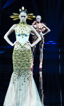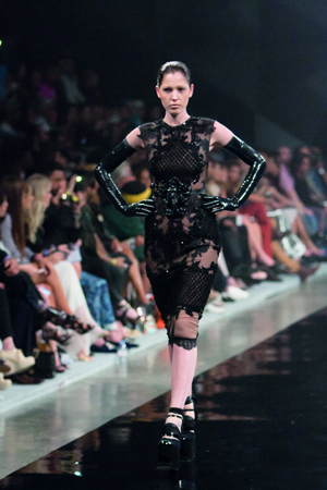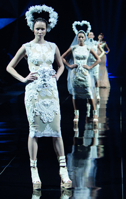 كثير من الدانتيل المنقوش، وكثير من التطريزات شديدة الدقة والكثافة والجودة المتناهية، التي زيّنت أجزاء مدروسة ومثيرة من الخامات الشفافة المعتمدة على التول، وهي خامة المصمم المفضلة دائماً، ليركز في التصميم على أجزاء معينة في منطقة الجذع والأرداف، بينما تعرّقت وتسلقت تطريزات أخرى من تلك الرئيسة لتنتشر بكثافة أقل على أجزاء ومناطق أخرى من القماش ملتفة بدقة حول أجساد العارضات، مضيفاً لمسات محددة من الجلد الأسود اللمّاع على مناطق معينة من الخصر، التي نفرت على طريقة الـ«بيبلوم» المستديرة والمنفوخة حول الأرداف، كما أضاف تلك اللمسة من الجلد على طريقته الدراماتيكية، مسلحـة بعض عارضاته بدروع جلدية سوداء تزيّنت هي الأخرى بنقوش وخناجر دقيقة برزت حول الكتف والصدر، كما لو كانت الدروع مطعونـة بخناجر عدة.
