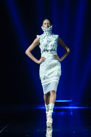 قدم المصمم أونيه أيضاً مجموعة مميزة من التصاميم التي اعتمدت اللون العاجي، والتي بدت كما لو كانت مزيّنة بتطريزات شديدة السُمك والكثافة تداخلت مع بعضها بعضاً على كامل الفستان، أو أقرب إلى فكرة الفستان المحاك بالكامل، ولكن بخيوط سميكة وعريضة جداً، تضفّرت فيه النقوش وتداخلت مكونة خطوطاً عرضية وقلادات أفقية شديدة الفخامة.