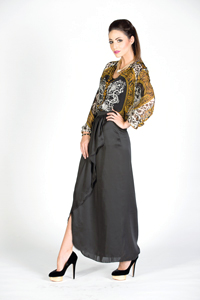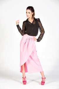 تفاوتت التنانير بين الواسعة وتلك المتموجة الأقل اتساعاً، معتمدة القصة الرومانسية المتسعة المتموجة للتنانير المحددة بأحزمة معدنية ذهبية عريضة فوق قمصان شيفونية واسعة، ما أعطى تأثيرا مميزا لنحول الخصر رغم اتساع كلتا القطعتين، كما قدمت المصممة فكرة التنورة الملتفة، التي تميزت بقصتها غير الضــــيقة اللافتة، مع تزيين الطبقة الخارجية الملـــــتفة بتجمع «درابيه» المنسدل ذات تموجات ناعمة، وهي القصة التي تكشف مع الحركة والمشي أو الجلوس جزءاً من الساق، والتي فضلت أن تقدمها باللون الأسود لتعزز من قدرتها على التناسب ومختلف ألوان وأفكار القمصان، مستخدمة قماش الحرير الناعم، بينما اعتمدت الفكرة ذاتها مع قماش الكريب الوردي الفاتح، الذي تميز بسماكته ووضوح قصته بسبب طبيعة القماش.