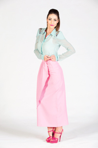 إضافة إلى الأفكار المتنوعة من القمصان، قدمت المصممة تنوعاً في أفكار قصات التنانير أيضاً، التي اجتمع معظمها على الطول الواصل حتى الكاحل، ما عدا تنورة وحيدة وصلت إلى الركبة، معتمدة القصة الواسعة المتموجة منها، التي قدمتها باللون الوردي الفاتح.