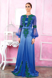 يعد قماش الدانتيل الفرنسي مرادفاً دائماً لكل ما هو راقٍ وغني، وقد اعتمد المصمم لمسات شديدة البساطة من خامات الدانتيل المشابهة في لونها للون الحرائر التي اتخذت خامة رئيسة لكل التصاميم، مزيناً بالدانتيل أجزاء بسيطة من الجذع تارة، والأذيال والحواشي تارة أخرى، إضافة إلى لمسات من الأكمام، بينما تنوعت المجموعة أيضاً في أفكار الأكمام التي انسدلت متسعة وطويلة تارة، ومستقيمة تضيق عند الكوع لتتسع منتفخة من التور، لبعطي هذا التصميم، تحديداً، لمسة قديمة فيكتورية بسيطة غير ملحوظة ولكن محســوسة، استــطاع من خلالها أن يخفف من الهيمنة الصارخة للمسة الشرقية، دون الخروج عن روح المجموعة.