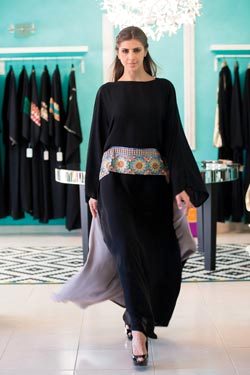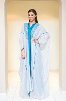 كذلك قدمت الدار مجموعة من العباءات متعددة القصات التي تزينت أيضاً بتطريزات مستوحاة من شعار الحملة، وتداخلت مع تطريزات إسلامية، وأخرى تحمل تعبيرات نباتية، استقرت على منطقة الخصر كأشباه أحزمة، أو على الأكتاف والصدر، والظهر بتصاميم بدت أقرب إلى الترويجية للحملة.