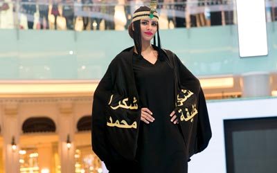 عارضة أزياء تقدم عباءة كتب عليها «شكراً خليفة.. شكراً محمد»، ضمن عرض للعبايات هذا الأسبوع بـ«دبي مول» في دبي. تصوير: أحمد عرديتي