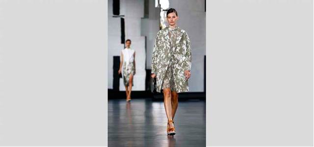 مصمم السيدة الأولى المصمم التايواني - الكندي جيسون (مصمم الأزياء المفضل لدى السيدة الأميركية الأولى ميشيل أوباما)، مزج اللون الأزرق الداكن مع درجات الأخضر بأقمشة لامعة في مجموعته لملابس النساء والملابس الرياضية التي عرضها في وسط مانهاتن. |